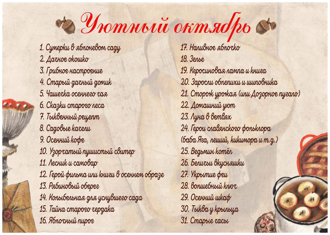 Мы вместе придумываем темы на весь месяц, по которым можно рисовать (всё по желанию): все темы или несколько. Что-то из этих тем я скорее всего буду рисовать на эфирах.